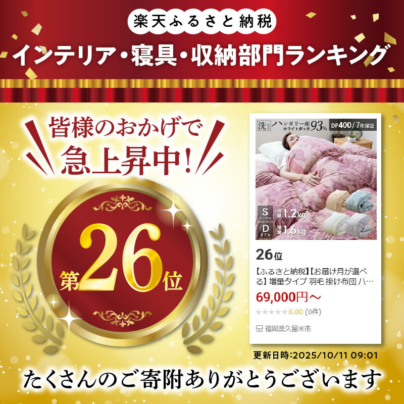 - 【ふるさと納税】【お届け月が選べる】 増量タイプ 羽毛 掛け布団 ハンガリー ホワイトダック ダウン 93% DP400 洗える 日本製 充てん量 シングル 1.2kg / ダブル 1.6kg 選べる 配送月 カラー 保温 立体キルト ダウンプルーフ 抗菌 防臭 江崎ふとん 久留米市 送料無料