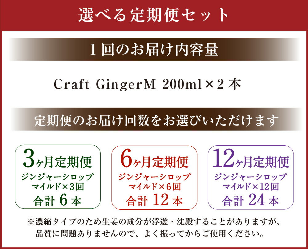 - 【ふるさと納税】<選べる定期便>Craft GingerM ふんわり生姜香る ジンジャーシロップ 1回あたり計400ml(200ml×2本) 1ヶ月毎 3回 6回 12回 無添加 てん菜グラニュー糖 黒糖 レモン果汁 健康 飲料 高知県産 国産 高知県 香美市 送料無料