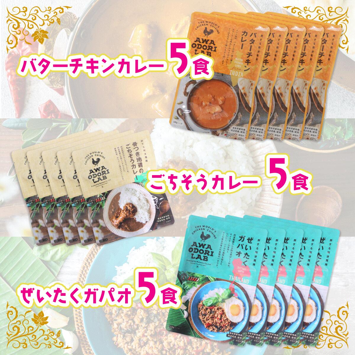- 【ふるさと納税】旅する阿波尾鶏シリーズ 3種 各5食入 計15食 バターチキンカレー ごちそうカレー ぜいたくガパオ カレー ガパオ タイ料理 常温 レトルト 父の日