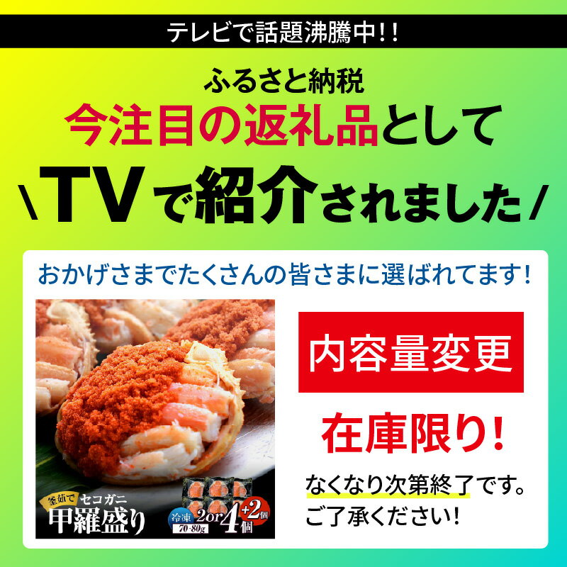 - 【ふるさと納税】 TVで紹介【生活応援!】セコガニ 釜茹で 甲羅盛り【選べる個数 2個・6個(数量限定で4個入りに+2個)※在庫なくなり次第終了!】むき身 かにみそ カニ味噌 蟹 カニ ほぐし身 ズワイガニ セイコガニ 松葉ガニ せいこがに かに コッペガニ 個包装 送料無料