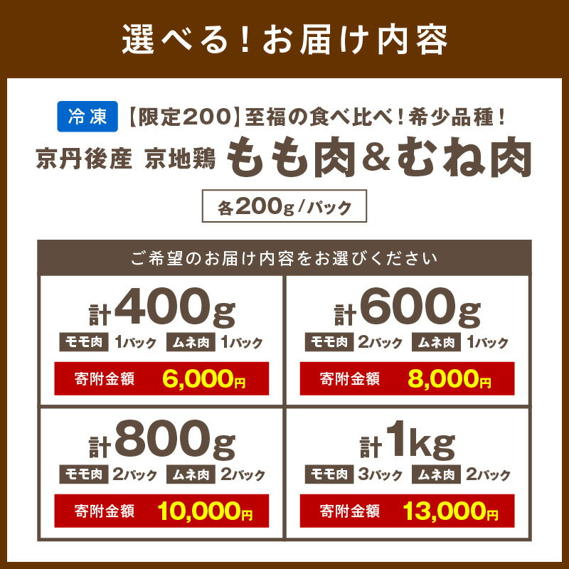 【ふるさと納税】【限定200】至福の食べ比べ!希少品種!京丹後産 京地鶏 もも肉&むね肉 400g~1kg 選べる 内容量 ふるさと納税 京丹後 鶏肉 もも肉 むね肉 京地鶏 料理 BBQ 食べ比べ セット 小分け 京都 ブランド鶏 生産者応援 送料無料