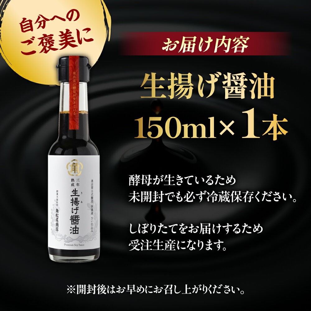- 【ふるさと納税】【3年熟成】生揚げ醤油150ml 1本 さい仕込み 調味料 高級 醤油 しょうゆ お醤油 魚 刺身 ステーキ お歳暮 島根県雲南市/有限会社紅梅しょうゆ[AICV013]