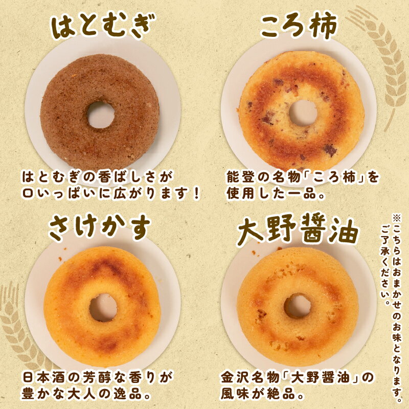 【ふるさと納税】 焼き ドーナツ 8個 能登 食材 使用 こだわり 素材 洋菓子 お菓子 焼菓子 スイーツ デザート おかし 菓子 塩 米粉 おまかせ はとむぎ ころ柿 酒粕 いちご ブラックベリー チョコレート 醤油 ドーナッツ 揚げない ヘルシー 石川県 能登 羽咋 災害 復興支援