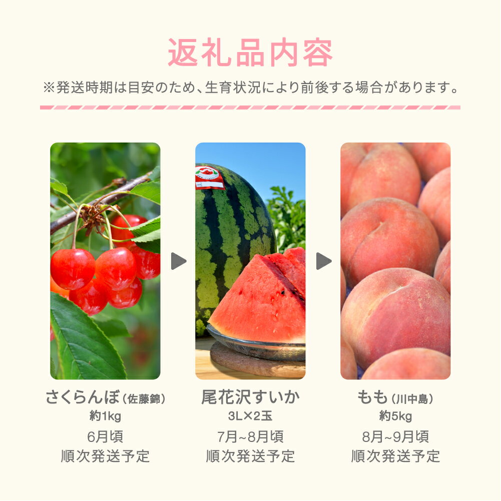 - 【ふるさと納税】【先行予約】 フルーツ 定期便 さくらんぼ 佐藤錦 すいか もも 桃 川中島 全3回 果物 フルーツ 令和8年産 2026年産 山形県産 ja-ft3xx-b