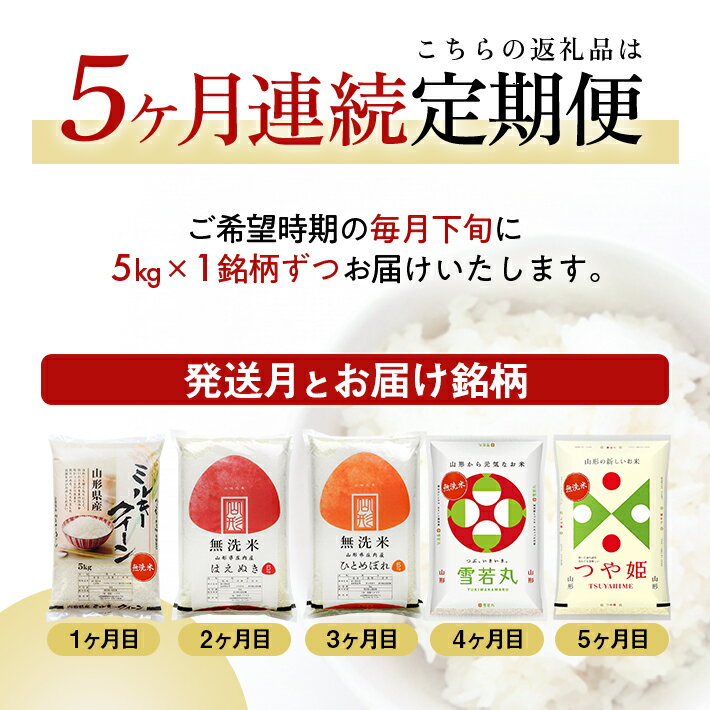 - 【ふるさと納税】≪5ヶ月定期便≫ 無洗米 5銘柄食べ比べセット 各5kg 5ヶ月連続 計25kg 令和7年産 ミルキークイーン はえぬき ひとめぼれ 雪若丸 つや姫 山形県庄内産 毎月下旬にお届け 東北 山形県 遊佐町 庄内地方 庄内米 白米 連続定期便
