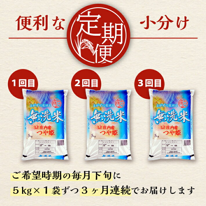 【ふるさと納税】≪3ヶ月定期便≫ 無洗米 つや姫 5kg×3ヶ月連続 計15kg 特別栽培米 山形県庄内産 ご希望期間の毎月下旬にお届け 東北 山形県 酒田市 庄内地方 庄内平野 米 無洗米 ブランド米 庄内米 定期便
