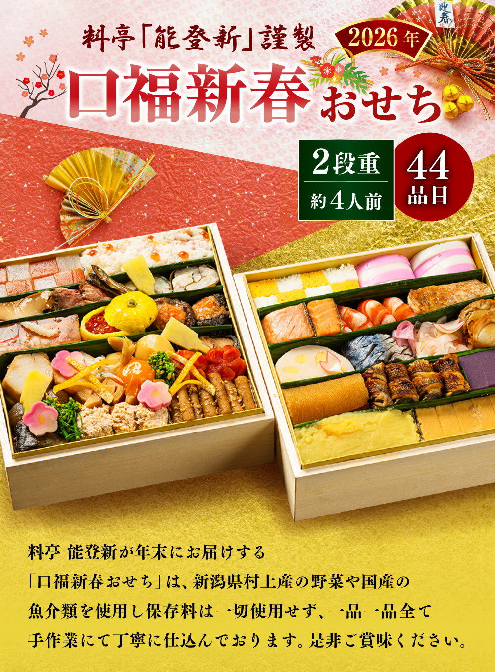 【ふるさと納税】【数量限定】料亭能登新謹製 2026年「口福新春おせち」二段重(約4人前 全44品)おせち お節 御節 おせち料理 お取り寄せ 二段 お正月 正月 村上市 新潟県 送料無料 冷蔵 冷蔵配送 1069013