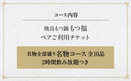 - 焼鳥もつ鍋もつ福 名物全部盛り『名物コース』2時間飲み放題つき全10品ペアご利用チケット