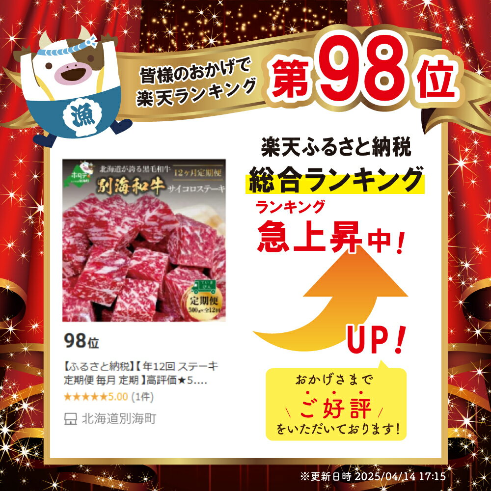 - 【ふるさと納税】 高評価★5.0 【 年12回 ステーキ 定期便 毎月 定期 】 黒毛和牛「別海 和牛 」サイコロステーキ 用 500g( 小分け 250g×2パック)× 12ヶ月 【全 12回 】( ふるさと納税 ステーキ 定期便 ふるさと納税 肉 定期便 ふるさと納税 牛肉 定期便 訳あり 赤身 )