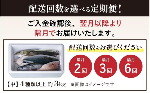 - 【定期便 隔月3回】【朝獲り】漁師厳選 鮮魚セット (中) 4種類以上 約3kg 魚 詰め合わせ 鮮魚ボックス 直送 鮮魚 新鮮 煮物 焼き物 お造り 刺身 晩酌 食卓 BBQ 急速冷凍 真空パック 鮮魚セット 詰合せ 鮮魚店 厳選 お任せ 鮮度 産直 海鮮 加熱用 福井県 南越前町 越前 盛り合わせ おまかせ お楽しみ おつまみ おかず ご飯のお供 送料無料 さへい 河野 越前 北陸