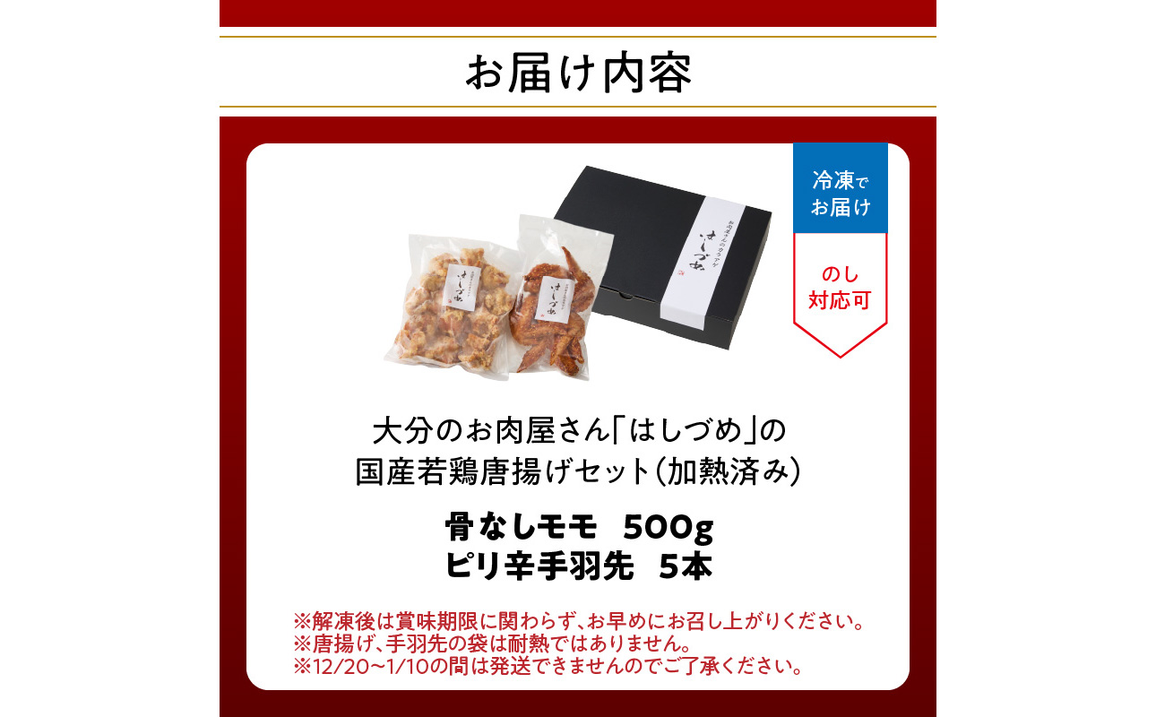 - 【A03057】大分のお肉屋さん「はしづめ」の国産若鶏唐揚げセット 骨なしモモ500gと冷やしピリ辛手羽先5本 加熱済み
