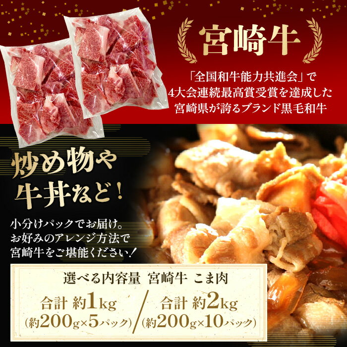 - 【ふるさと納税】<宮崎牛こま>選べる内容量 ※入金確認後、2ヵ月以内に順次出荷します。切り落とし 切落し こま肉 牛こま 切り落し 牛肉 和牛 黒毛和牛 お肉 ブランド牛 1kg 2kg 普段使い 料理 夕飯 使いやすい 炒め物 マルミヤストア宮崎 国富店 宮崎県 国富町【冷凍】