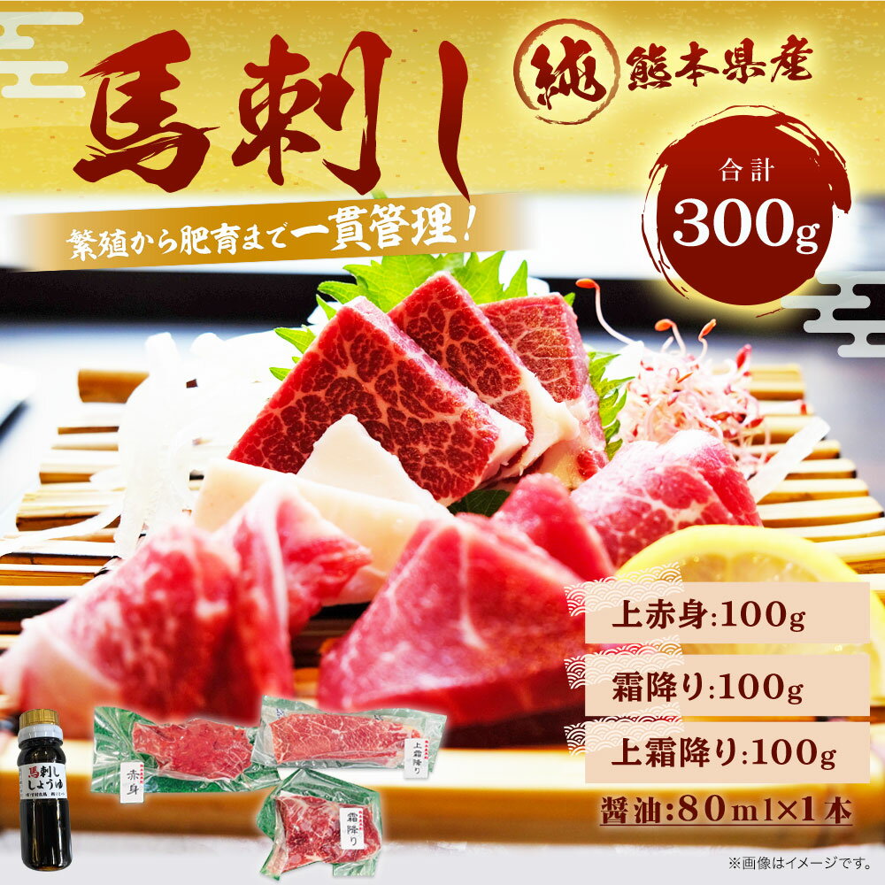 【ふるさと納税】 純熊本県産 馬刺しセット(小)300g 上赤身 100g 霜降り 100g 上霜降り 100g 醤油80ml×1本 冷凍 熊本馬刺し セット ギフト おつまみ プレゼント 食べ比べ 送料無料