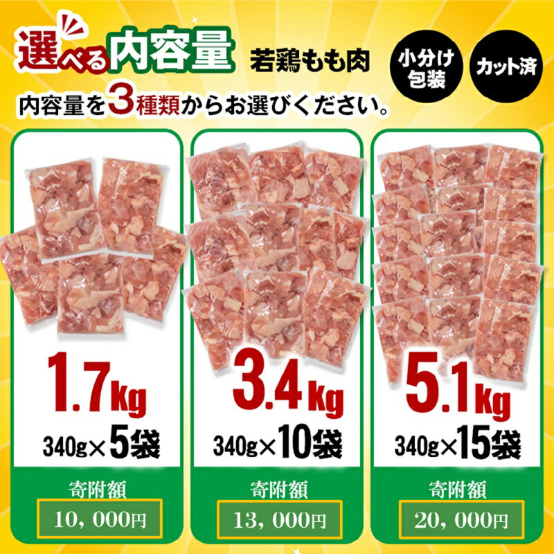 - 【ふるさと納税】 【容量と発送時期が選べる】 宮崎県産若鶏もも肉カット「1.7kg・3.4kg・5.1kg」 鶏肉切身小分け 国産 九州産 若鶏 肉 とり もも モモ肉 たっぷり 5kgオーバー 大容量 大量 一口サイズ 唐揚げ チキン南蛮 ふるさと納税 宮崎県