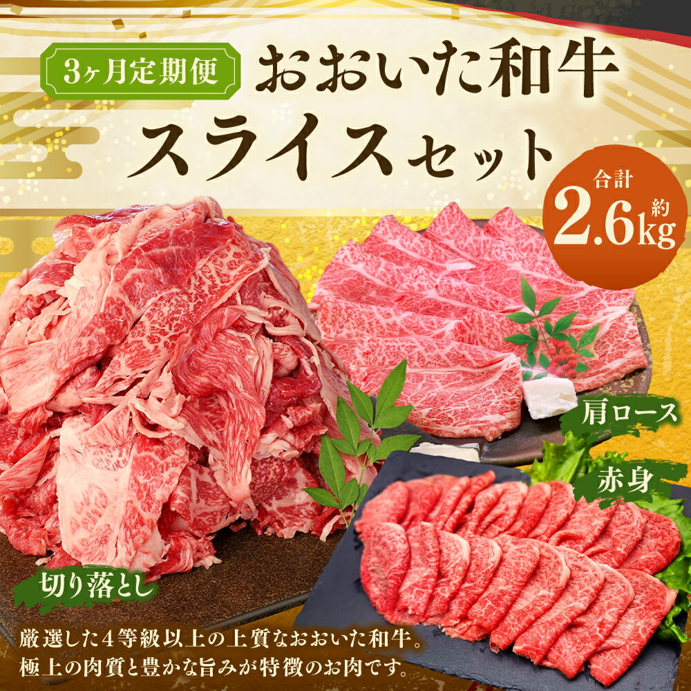 - 【ふるさと納税】【3ヶ月定期便】毎月違うセットが届く! おおいた和牛 スライスセット 合計2.6kg 牛肉 肉 お肉 和牛 国産牛 4等級以上 お楽しみ 食べ比べ 大分県産 竹田市 送料無料