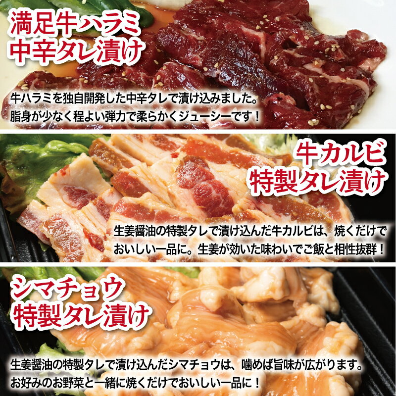 - 【ふるさと納税】タレ漬け 牛肉 3種 セット 満足 牛ハラミ 中辛タレ カルビ シマチョウ 生姜醤油タレ 選べる 内容量 1.5kg / 3kg / 4.5kg 味付け ハラミ 小分け 焼くだけ 簡単調理 BBQ 焼き肉 野菜炒め お取り寄せグルメ 大阪府 泉佐野市 送料無料 肉の泉佐野