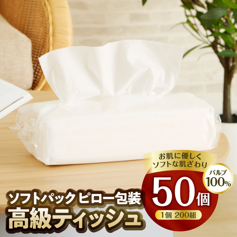 - ティッシュペーパー ソフトパック 50個 (1パック 200組 (400枚)) ピロー包装 箱なし 詰め替え 高級ティッシュ 国産 パルプ100% 富士山 雪解け水 田子浦パルプ 富士市 日用品