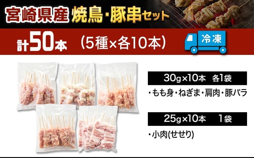宮崎県産焼鳥串50本(5種×10本)セット_19-M601_(都城市) 宮崎県産 串 5種50本 焼鳥 もも身 ねぎま 肩肉 せせり 豚バラ 若鶏 豚肉