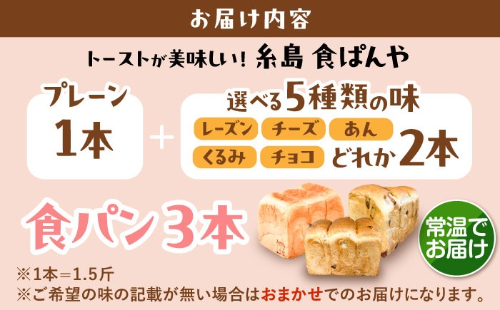 - トーストが美味しい!【常温】こだわり 食パン 3本 (プレーン 1本 + 選べる味 2本) 糸島市 / 糸島食ぱんや [AAP022][AAP022] パン 食パン ブレッド トースト 卵不使用 離乳食 マーガリン不使用 無添加