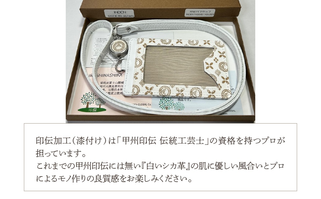 白い甲州印伝「URUSHINASHIKA」パスケース(リール付き) FCR006
