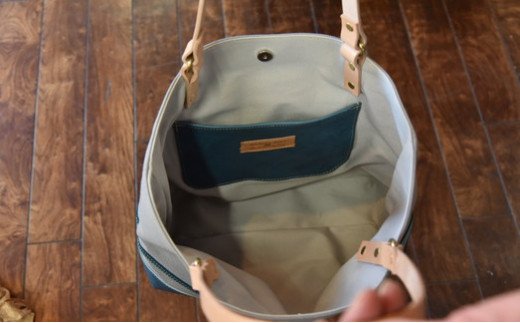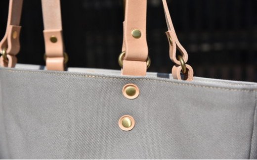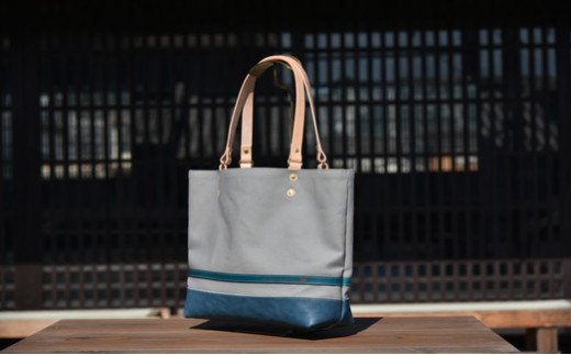 - 岡喜近江牛レザーと帆布のトートバッグ グレー(琵琶湖ブルー)【Lサイズ】【CC17W】