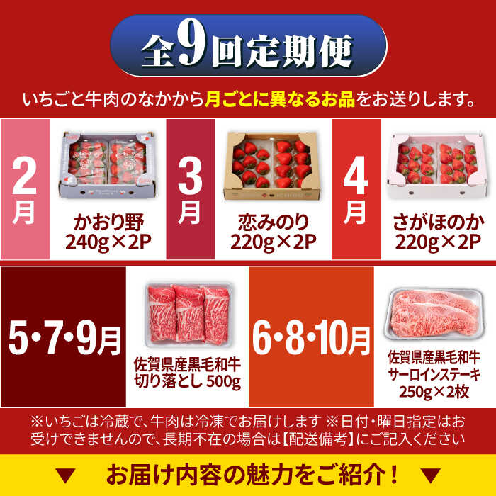 - 【ふるさと納税】【R8年2月以降発送】【全9回定期便】しろいしの味覚よくばりセット(赤いちご3種と佐賀県産黒毛和牛)/ いちご 苺 果物 フルーツ 黒毛和牛 切り落とし 牛 牛肉 すきやき すき焼き しゃぶしゃぶ 佐賀県 白石町 [IZZ022]