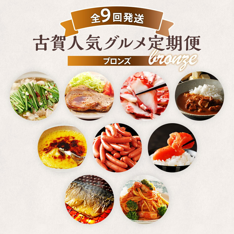 【ふるさと納税】古賀人気グルメ定期便 ブロンズ【年9回発送】 (もつ鍋・味噌豚ステーキ・真蛸・バターチキンカレー・クレームブリュレ・ウインナー・明太子・焼き塩さば・ピエトロパスタソース&麺) 定期発送 送料無料