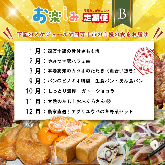 【ふるさと納税】【年末限定】 7回 定期便 四万十 人気 グルメ お楽しみ しまんと ふるさと 定期便 5万円 Bコース 今だけ 限定 野菜 ガトーショコラ 生食パン あん食パン 魚 タタキ 鰹 かつお 肉 骨付き 四万十鶏 豚肉 はらみ フルーツ みかん 高知 四万十市 R7-615