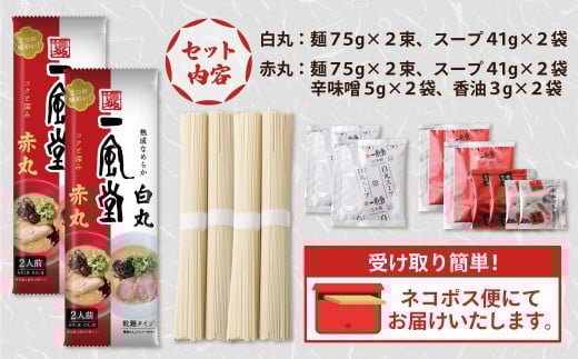 - W08-09 一風堂 とんこつラーメン 白丸・赤丸(各2食入)2袋 とんこつ 豚骨 ラーメン ラー麦 スープ付き 福岡県 アウトドア キャンプ お土産 プチギフト ネコポス便 受け取り簡単 ポスト投函 送料無料