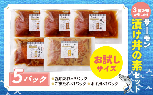 - W61-127 サーモン漬け丼の素(醤油・ごま1・ポキ)計5パック