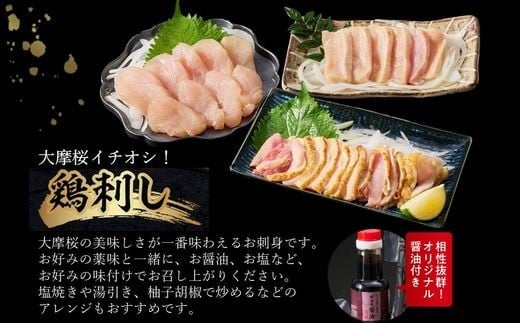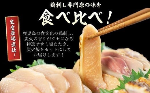 085-15 「さつま極鶏大摩桜」鶏刺し3種&特選ササミ塩たたきと炭火焼 食べ比べセット