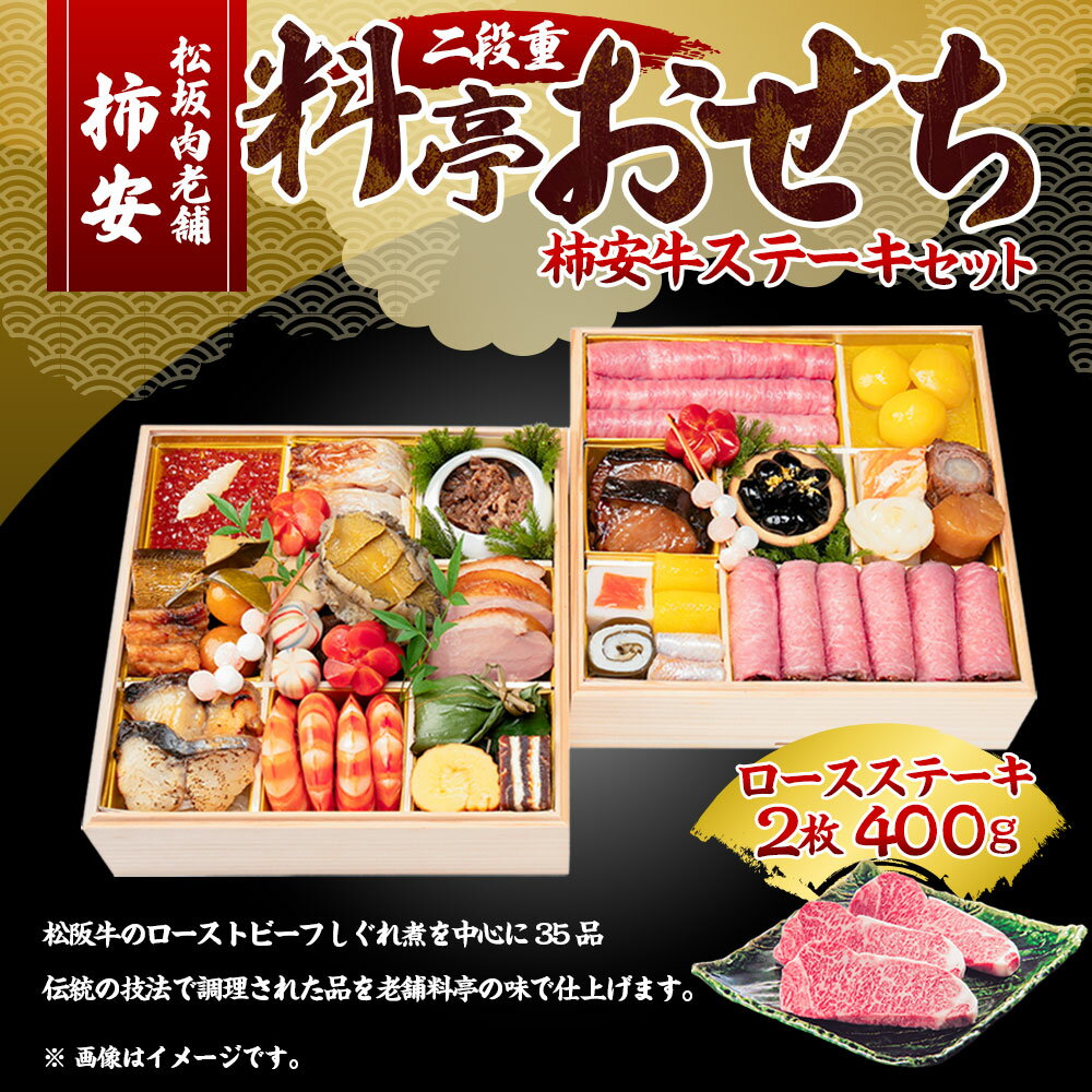 【ふるさと納税】松阪肉老舗 柿安 料亭おせち 二段重 柿安牛ステーキセット ロースステーキ(2枚) 牛肉 お肉 ロース 松阪牛 ローストビーフ いくら 栗きんとん ずわい蟹真丈 水産物 お節 御節 おせち料理 お正月 年末年始 三重県 桑名市 送料無料 【2025年12月31日着】
