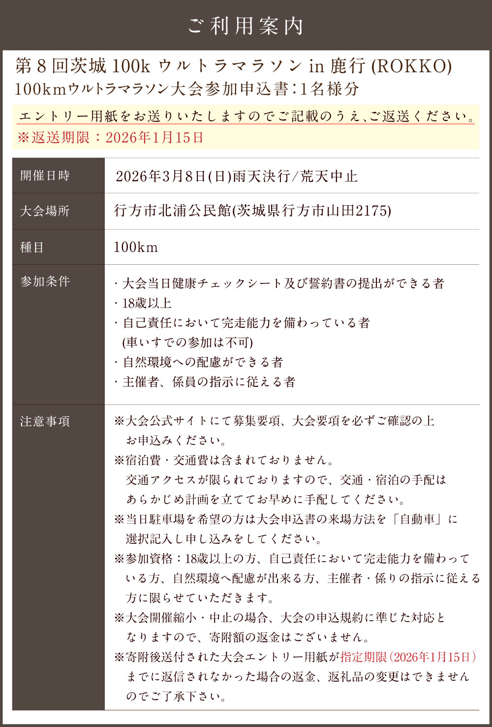 【ふるさと納税】第8回茨城100kウルトラマラソンin鹿行(ROKKO) 大会参加券(1名様) 1名様 マラソン 参加券 茨城県 神栖市 送料無料 【2025年11月上旬~2026年1月上旬発送予定】