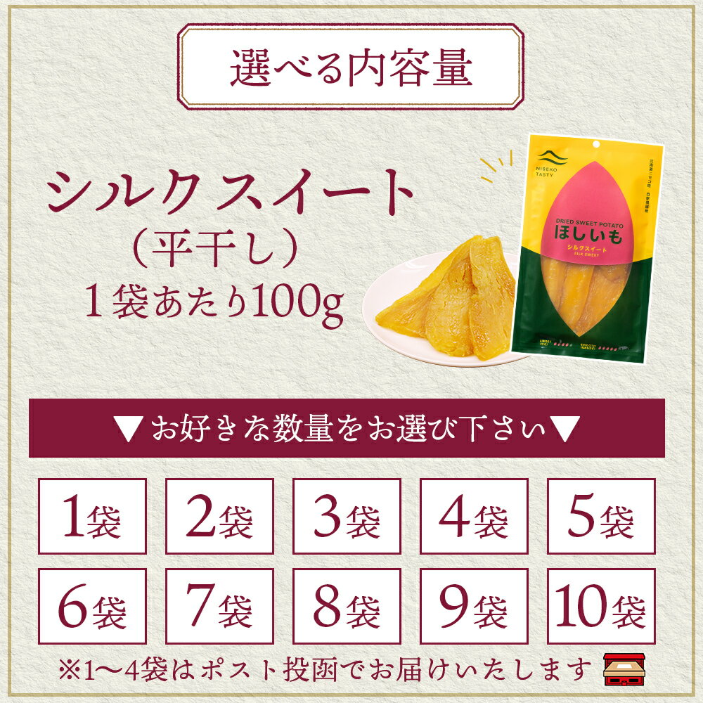 【ふるさと納税】【選べる袋数!】【ニセコ町】シルクスイート(平干し) 100g | 小分け 北海道 健康 デザート おやつ 間食 ニセコ 甘い 濃厚 やわらかい お茶うけ 風味 贅沢 おいしい 高品質 栄養価 豊富 食物繊維 食品 健康志向 お取り寄せ 北海道 ニセコ町 ニセコ【48011】