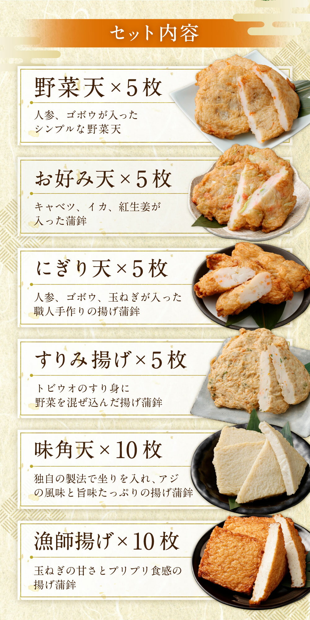 - 【ふるさと納税】新鮮長崎かんぼこ揚げたてセット 野菜天・お好み天・にぎり天・すりみ揚げ(各5枚) 味角天・漁師揚げ(各10枚) 計40枚 かまぼこ 揚げ蒲鉾 魚肉 練り物 お正月 冷蔵 長崎県 長崎市 送料無料