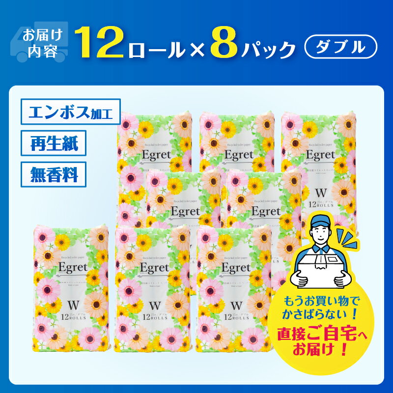 - 【ふるさと納税】 トイレットペーパー ダブル 96ロール(12R×8パック) エグレット 無香料 ホワイト エンボス加工 再生紙100% 備蓄 防災 生活必需品 日用品 消耗品 生活用品 富士市 [sf002-389]