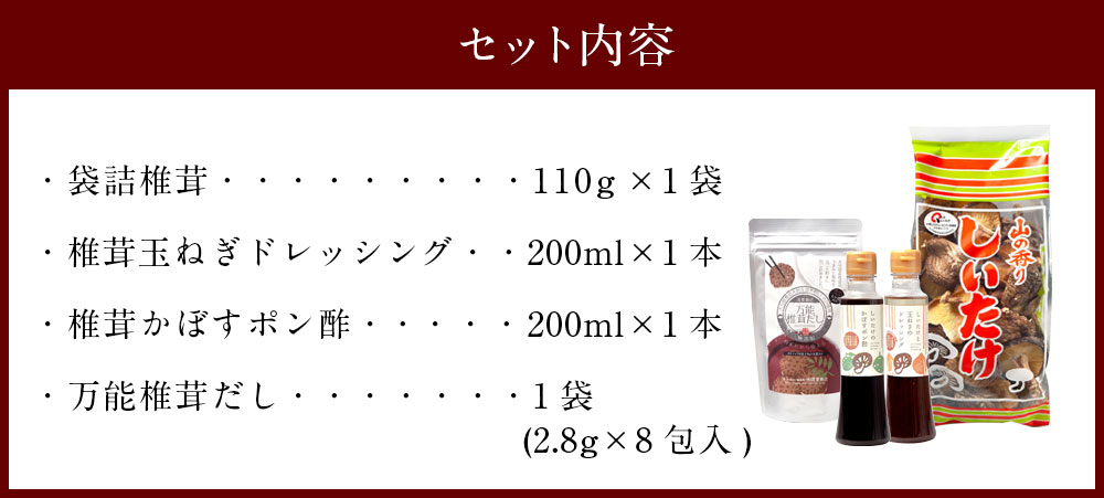 - 【ふるさと納税】椎茸問屋のこだわりセット 椎茸 袋詰め椎茸 椎茸 たまねぎ ドレッシング 椎茸かぼすポン酢 ポン酢 万能椎茸だし 万能だし セット 詰め合わせ しいたけ どんこ 送料無料