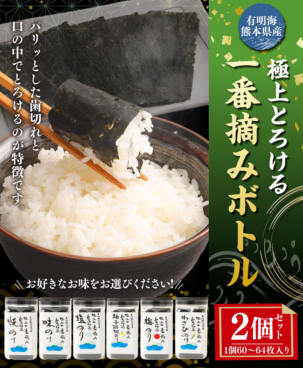 【ふるさと納税】<選べる種類>有明海熊本産 極上とろける一番摘み ボトル 焼きのり・味のり(無添加)・塩のり・柚子胡椒のり・梅のり・わさびのり 1ボトル64枚入・60枚入 2個 海苔 のり 味付けのり 味つけのり 味海苔 おにぎり ご飯のお供 九州