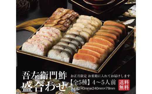 - 【ふるさと納税】【12月31日お届け】年内発送 先行予約 おせち 吾左衛門鮓の盛り合わせ 2025【4~5人前】(鯖 穴子 蟹 鱒 鯛 各5切れ)(さば あなご かに ます たい)お重箱【25-035-003】米吾 ござえもんずし 和食 お寿司 海鮮 正月 鳥取県 米子市 数量限定
