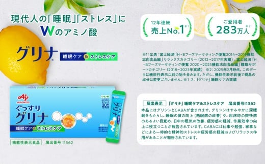 - 睡眠サポートサプリ、12年連続売り上げNO.1 、愛用者数283万人突破、味の素(株) 「グリナ」(機能性表示食品) 睡眠ケア&ストレスケア 30本入り箱【三重県 三重 四日市市 四日市 四日市市ふるさと納税 四日市ふるさと納税】