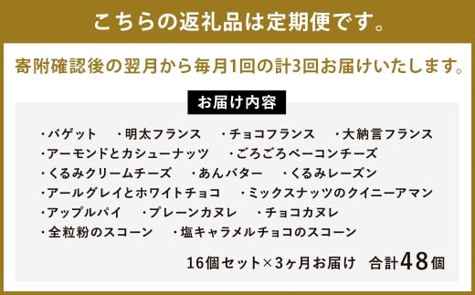 【3回定期便】konaの人気パン16個セット×3回お届け 合計48個
