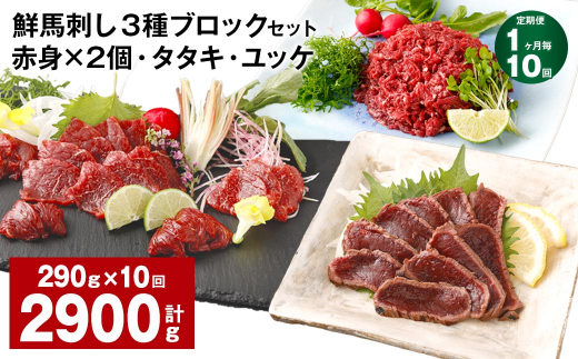 【1ヶ月毎10回定期便】鮮馬刺し 3種ブロックセット 赤身×2・タタキ・ユッケ