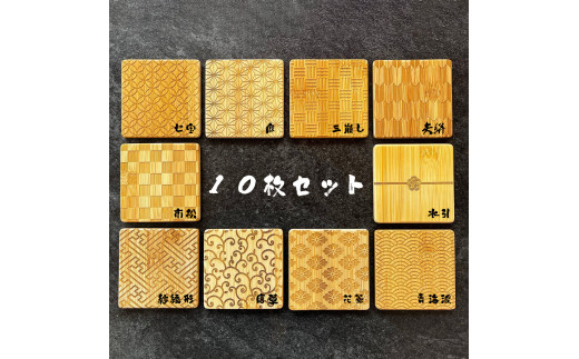 バンブーコースター 日本伝統柄 和柄10枚セット 和柄9種+水引のコースター1枚