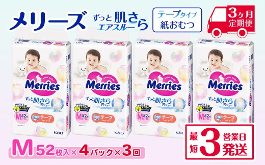 - [全3回定期便] メリーズ テープ ずっと肌さらエアスルー おむつ テープタイプ Mサイズ(52枚入り)×4パック |オムツ おむつ 紙オムツ 紙おむつ メリーズ ベビー用品 赤ちゃんグッズ 赤ちゃん用品 日用品 消耗品 贈り物 プレゼント