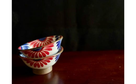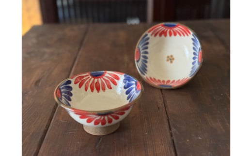 - 【陶芸工房ふじ】4寸マカイ<1枚焼き>菊模様赤青2枚セット 〇 読谷村 沖縄 手作り やちむん 茶碗 地場産品 焼き物 使い勝手 うちなーすぐりむん 鮮やか
