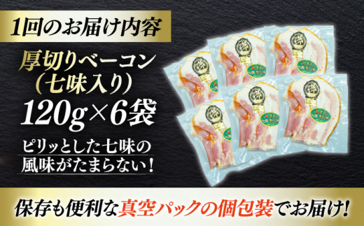 【全6回定期便】 厚切りベーコンスライス(七味入り)×6ケ 合計720g ブランドポーク『オズの箱入り娘』使用! 愛媛県大洲市/株式会社オズメッセ [AGAZ038] にく 肉 お肉 豚肉 ぶたにく 小分け 切り落としベーコン 燻製ベーコン 自家製ベーコン 焼肉 バーベキュー おかず おつまみ おすすめ 人気 お取り寄せ 送料無料 贈答 ギフト