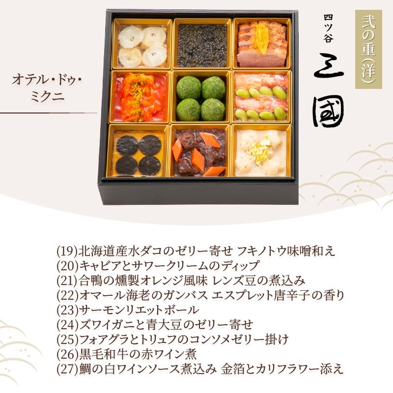 - オードブル おせち お正月 2026 和食 豪華 海鮮 魚介 肉 京都𠮷兆×オテル・ドゥ・ミクニ フレンチ 和洋 二段 華やか 期間限定 数量限定 27品 2人前 お酒に合う ワンランク上 有名シェフ監修 冷蔵 富士市 [sf093-009]
