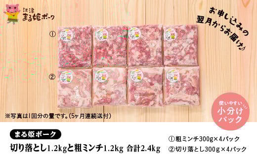 - 定期便 5ヶ月 まる姫ポーク 切り落とし1.2kg(300g×4パック)と粗ミンチ1.2kg(300g×4パック)計2.4kg×5回(12kg)【AK-23】|送料無料 国産 まる姫ポーク 豚肉 肉 切り落とし 粗ミンチ 料理 カレー シチュー ハンバーグ そぼろ 小分け パック 江津市|
