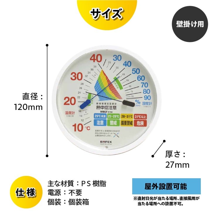 - 環境管理温・湿度計「熱中症注意」防雨型 TM-2464 熱中症対策 防雨型 温度計 湿度計 暑さ指数 4段階 注意 警戒 厳重警戒 危険 WBGT 健康管理 アナログ式 インテリア 電池不要 屋外設置可能 壁掛け用 [AJ127]