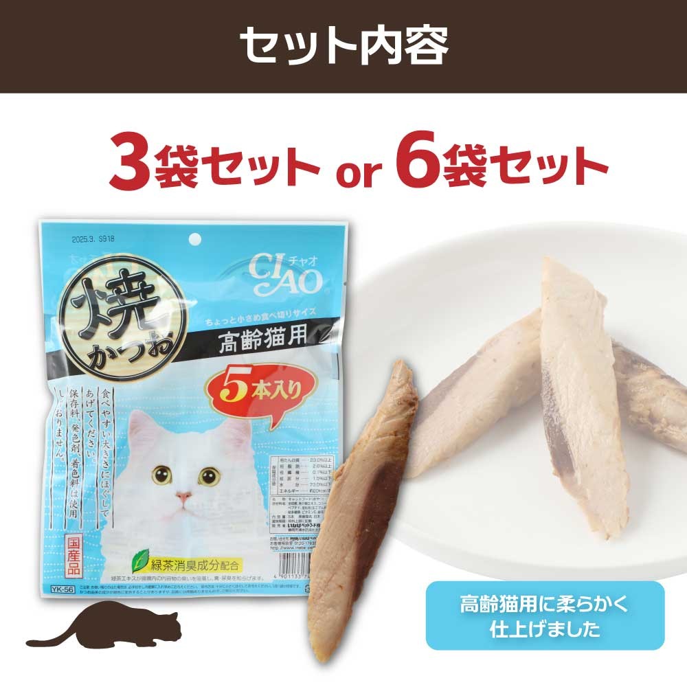 - シニア猫用キャットフード いなば チャオ・焼かつお(1種類5本入×3~6袋セット)選べる単品・定期便 ペットフード 高齢猫 猫 ネコ スティックタイプ 消臭 カツオ 魚肉 おやつ ごはん ご褒美 安心 国産品【R00042-1】